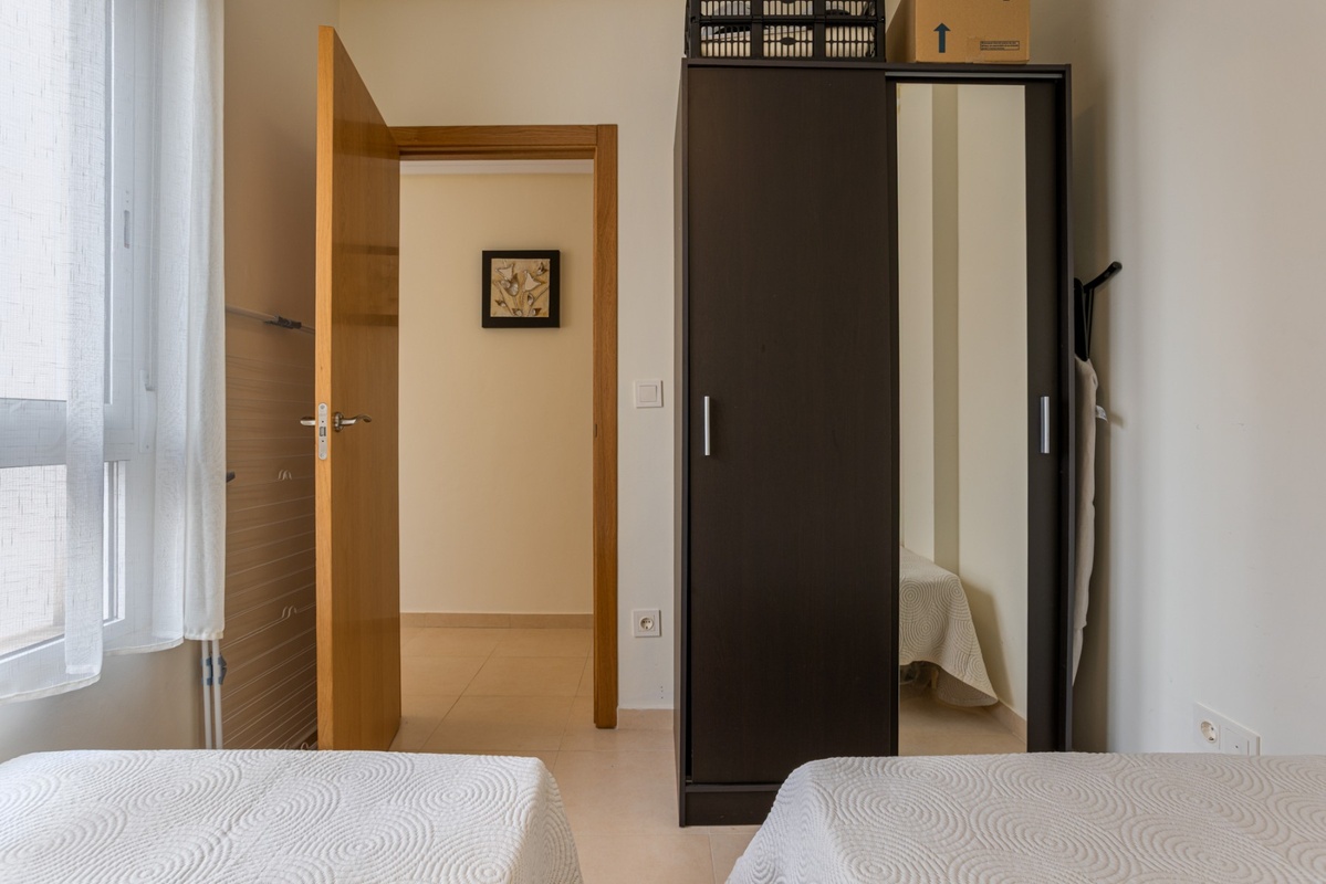 The apartment features two bedrooms with free standing wardrobes, as well as an extra built in wardrobe in the hallway, offering ample storage without sacrificing usable space.