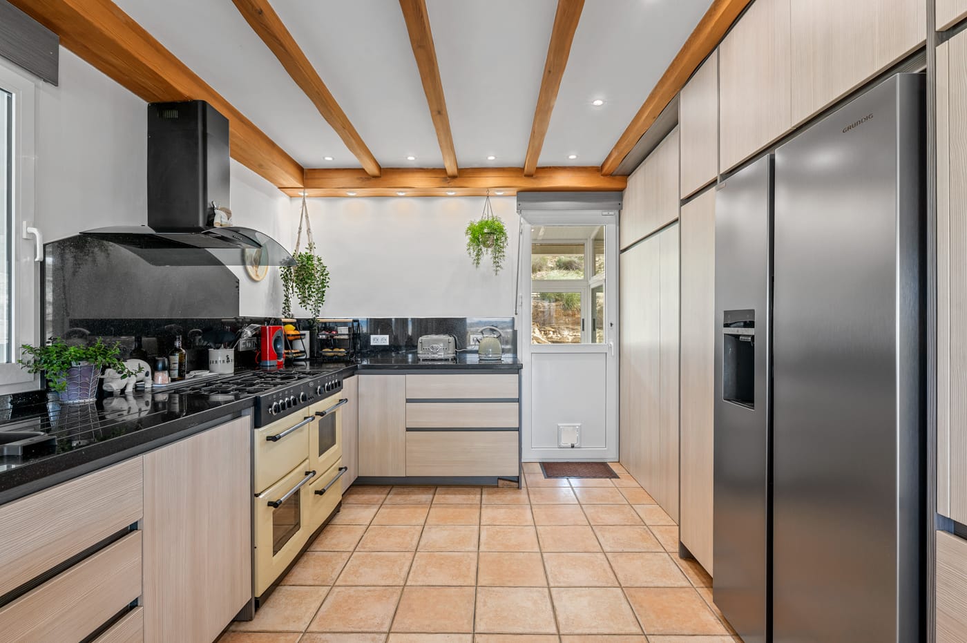 At the heart of the home is a large living and dining area with a charming log burner, creating a warm and inviting atmosphere. This space opens directly onto a beautiful terrace fitted with electric sun-shade blinds, ideal for both summer living and year-round entertaining. The fully fitted modern kitchen complements the home perfectly, offering both style and functionality.